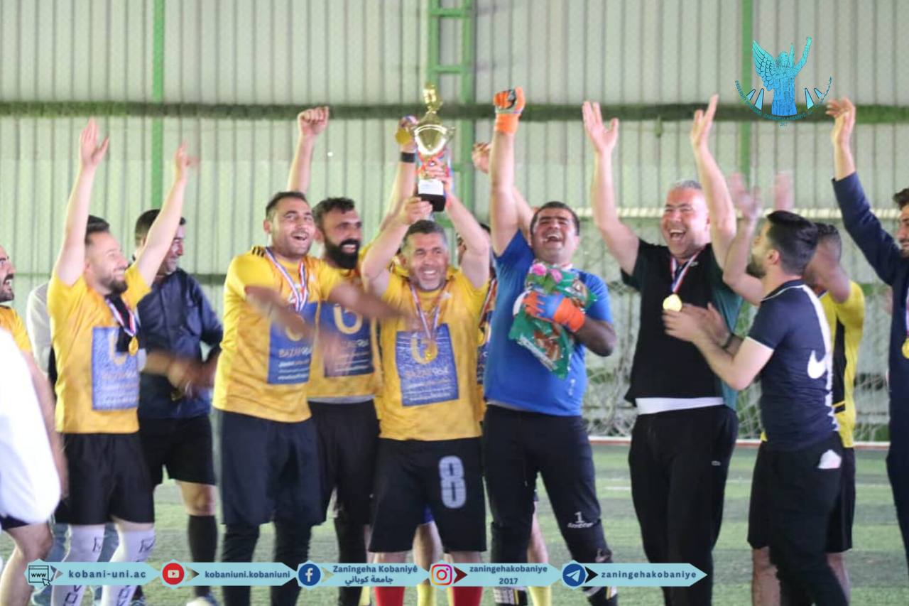 Captain Mohammed Abdi, the Head of Sports Activities, along with several members of the university team that won the Teachers’ Championship in the Euphrates Region, presented the championship trophy to the university